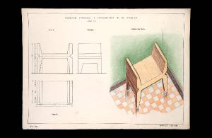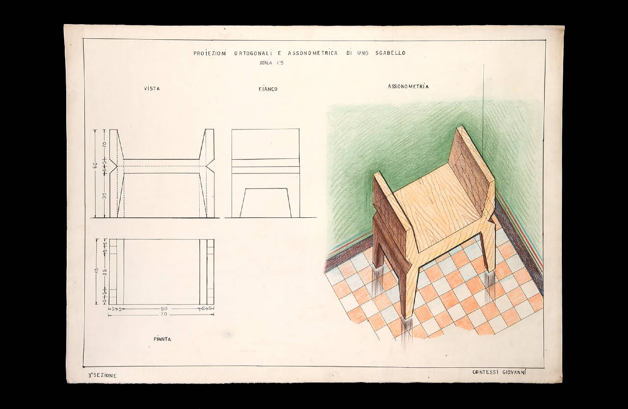 Proiezioni ortogonali e assonometrica di uno sgabello. Sgabello con proiezioni e assonometria