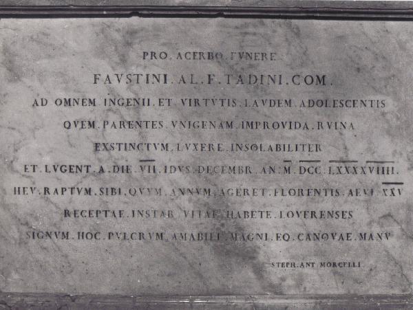 - NOTIZIE STORICO CRITICHE Il basamento della Stele Tadini fu eseguito a Milano dallo scultore veronese - ma attivo a Milano - Antonio Pasquali (Carteggio, nn. 70, 86-89, 91, 93, 95, 96) su modello del basamento della Stele Manzoni (Carteggio, n. 63). E' costituito da un gradino in marmo nero sormontato da una cornice di marmo giallo che inquadra una lastra di marmo bianco venato con l'iscrizione dettata da Stefano Antonio Morcelli (Carteggio, nn. 42-45; 52;), disegnata dall'abate vicentino Giovanni Battista Trecco e incisa dal Pasquali.\nCome riporta la scheda compilata dalla Soprintendenza nel 1976, l'epigrafe venne commissionata dal conte a Stefano Antonio Morcelli, noto epigrafista bresciano, già nel 1816 ma, come risulta da corrispondenza conservata presso l'archivio dell'Accademia, venne redatta nella presente stesura solo nel 1820-1821.\nM. Albertario