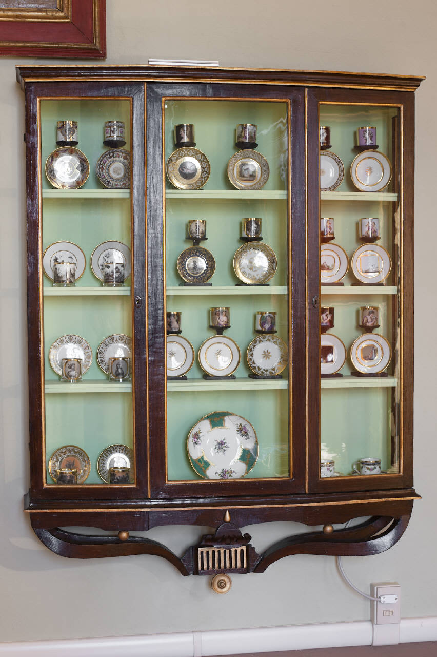 - NOTIZIE STORICO CRITICHE Come riporta la scheda compilata dalla Soprintendenza nel 1976, la coppia di vetrine in esame venne appositamente eseguita nel 1820 circa, probabilmente da artigiani locali, per l'allestimento delle porcellane della raccolta Tadini. La struttura dei mobili, appartenenti al legato testamentario del conte del 1828, fu realizzata secondo i dettami dello stile "Impero", come confermano le linee sinuose della decorazione del basamento (tipologia ricorrente nelle gambe dei tavoli circolari). Inizialmente in Sala XVIII, entrambi i manufatti vennero spostati in Sala XXII. Nella Galleria dell'Accademia si conservano vetrine identiche (nn. inv. Mobili M163-M164 e M165-166) prodotte successivamente su modello di quelle in esame.