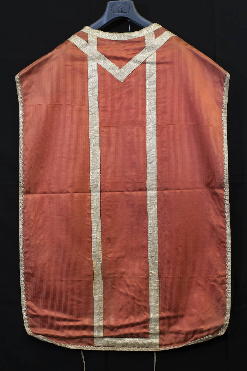 - NOTIZIE STORICO CRITICHE La pianeta in esame, databile all'inizio dell'Ottocento, è eseguita in seta rigata, ovvero in un tessuto caratterizzato dalla presenza di rigature longitudinali ottenute da un solo ordito. E' in rosa, il colore della gioia e della serenità introdotto da papa Pio V. Liturgicamente è il colore più raro essendo usato solo due volte l'anno, cioè nella terza domenica di Avvento e nella quarta domenica di Quaresima. \nCome riporta la scheda compilata dalla Soprintendenza nel 1976, oltre alla pianeta sono stati riscontrati anche una stola (misure cm 12 x 200), un manipolo (misure cm 12 x 80), un velo di calice (misure cm 45 x 45) e una borsa di corporale (misure cm 35 x 35). L'intero paramento liturgico fa parte del legato del conte Tadini del 1828.