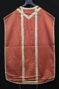 Pianeta in seta rosa rigata. Gallone in seta bianca e argento laminato eseguito a telaio.