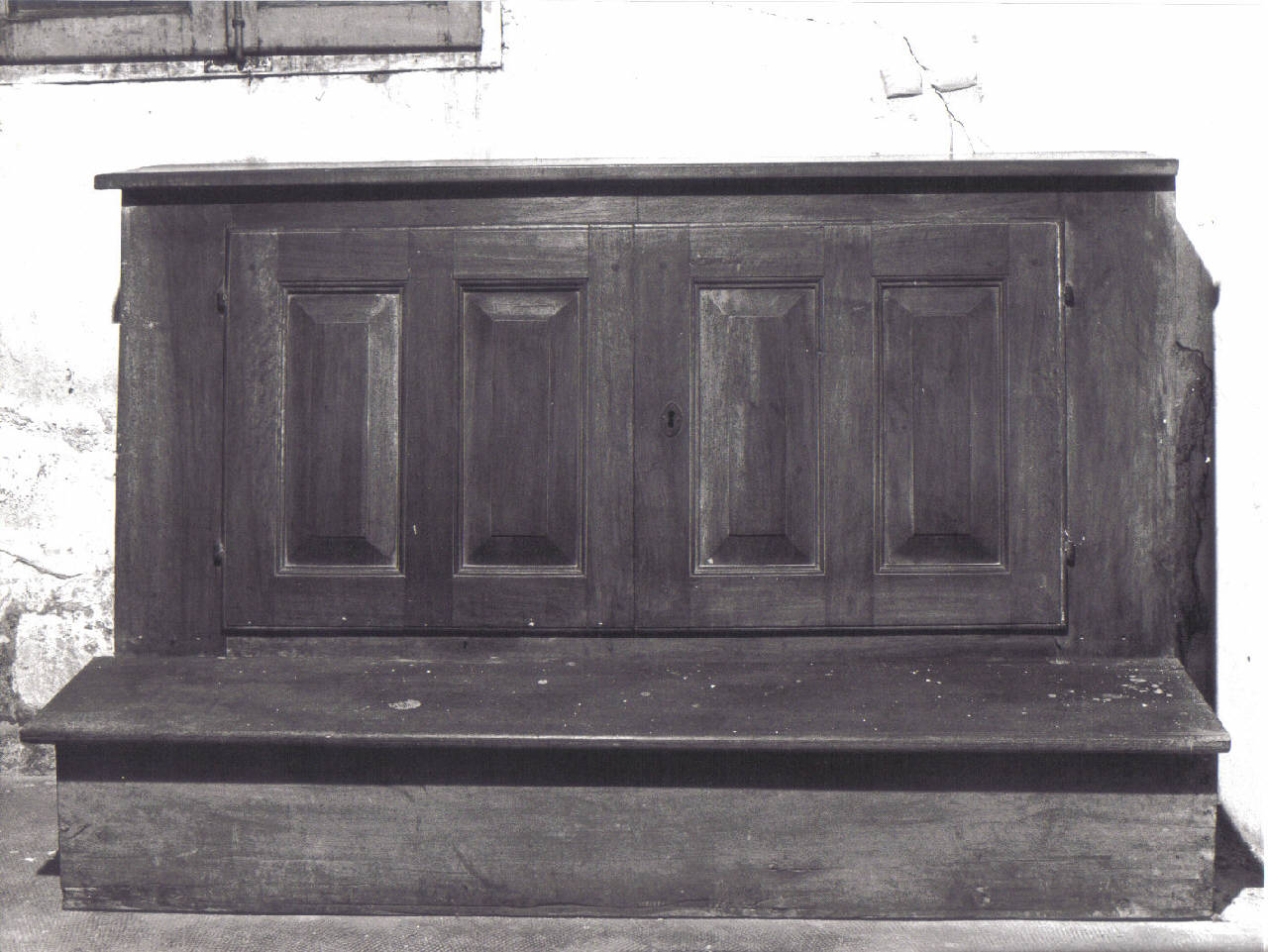 Inginocchiatoio in legno di noce. La base a zoccolo poggia direttamente sul pavimento; gli sportelli apribili sull'alzata presentano specchiature lisce con sottili cornici modanate.