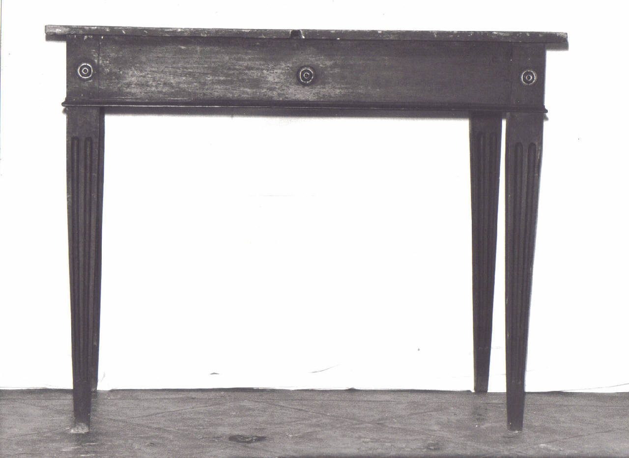 Tavolino in legno verniciato; sostegni scanalati di forma tronco-piramidale; fascia ornata con borchie metalliche applicate.