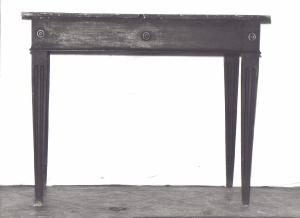 - NOTIZIE STORICO CRITICHE Il tavolino in esame è collocabile in quella fase neoclassica di inizio Ottocento caratterizzata dalla transizione dallo "stile Direttorio" allo "stile Impero" (si affermò tra il 1805 ed il 1814 ma rimase in auge anche nei decenni successivi). La struttura semplice e massiccia e lo slancio dei sostegni scanalati di forma tronco-piramidale richiamano ancora la linerità dello "stile Luigi XVI" mentre la superficie scura del legno, data dall'ulitizzo di uno strato di vernice, che accentua la severità della struttura quasi architettonica, è un tratto caratteristico dello "stile Impero". La foggia dell'arredo in esame venne riproposta anche negli anni del pieno "stile Impero" arricchiata da motivi decorativi ripresi dal mondo classico (romano, greco ed egizio). Come testimoniano i diversi esemplari presenti nella Galleria dell'Accademia e nella sacrestia della cappella gentilizia costruita vicino al palazzo, si tratta di una tipologia ampiamente diffusa. Il piano inizialmente in marmo, altra caratteristica tipica dell'Impero, è stato sostituito con uno foderato in tessuto e fissato da chiodi. \nIl tavolino fa parte del legato del conte Tadini del 1828.
