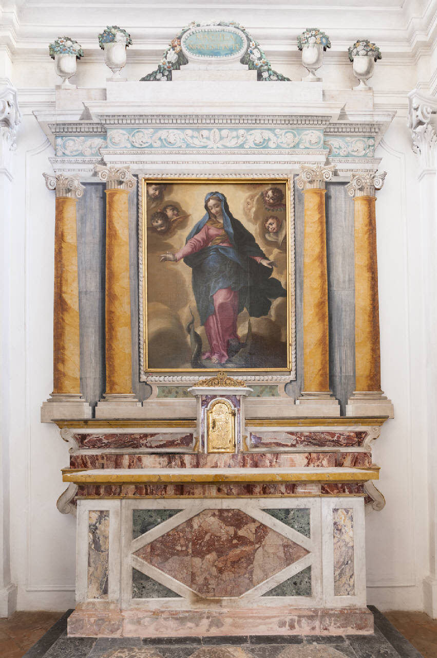 Altare formato da mensa e gradino, composti da specchiatura romboidale in marmo rosso venato bianco, profilata da cornici in marmo bianco e formelle triangolari in marmo verde. Al centro della mensa è fissato il tabernacolo.