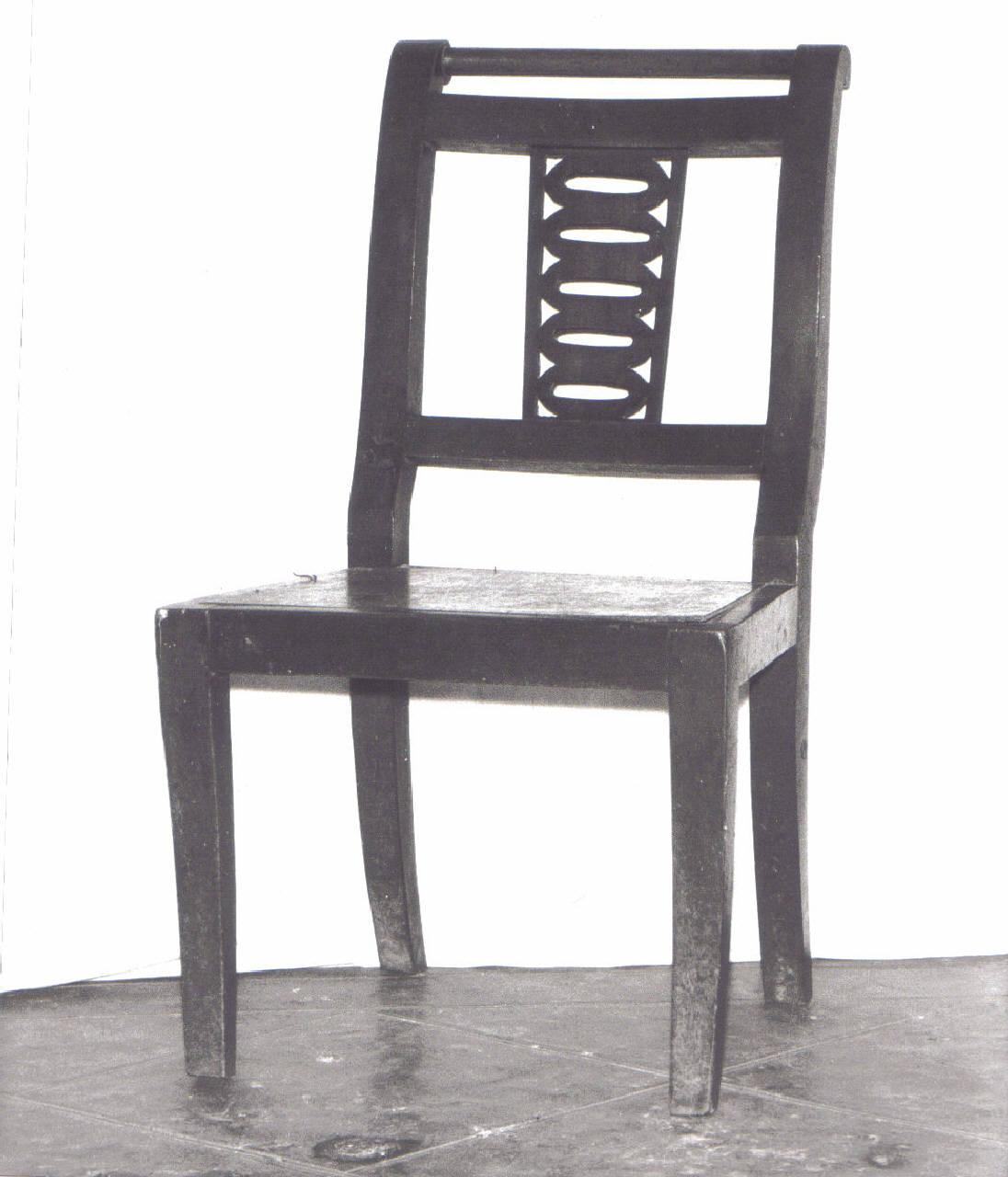 Serie di sei sedie in legno di noce. Gambe anteriori tronco-piramidili; gambe posteriori "a sciabola"; schienale a giorno con motivo geometrico nella sbarretta eseguito ad intaglio.