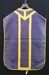 Pianeta in damasco viola. Motivo decorativo a sviluppo verticale costituito da racemi acantiformi alternati a vasi contenenti spighe e fiori. Galloni in seta gialla lavorati a telaio.