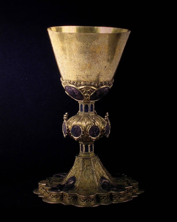 Calice con piede espanso, dal profilo mistilineo dato da otto lobi alternati a punte, rialzato su uno zoccolo traforato. Girali e fiori a bassorilievo su fondo sagrinato ricamano gli scomparti lobati; su quattro di essi sono applicate piastrine d'argento bulinate con l'immagine dei santi Lorenzo, Stefano, Vincenzo e Maurizio, con tracce di smalti traslucidi dalle tonalità basse. Il fusto a otto facce, colorito con smalti turchini, è interrotto alla mezzeria da un nodo schiacciato decorato con otto chiodi d'argento sporgenti, cuspidati, sui quali compaiono le effigi del Redentore, dei santi Pietro, Paolo, Andrea, Giacomo, Giovanni, Bartolomeo e di un altro santo. Anche i dischi erano ricoperti di smalti, così come le quattro medaglie con i busti dei Padri della Chiesa d'Occidente che formano il sottocoppa, terminante in un profilo di perle oltre il quale si allarga la superficie liscia della coppa.
