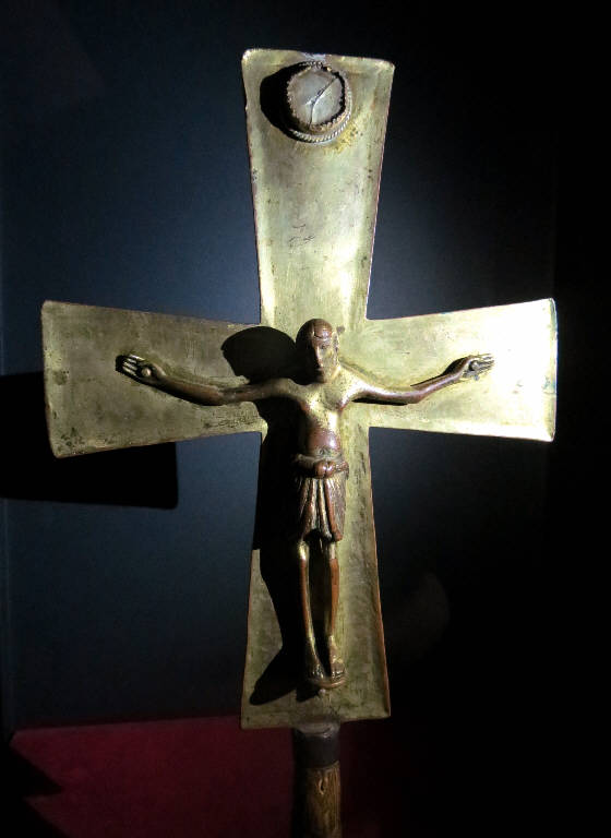 Croce astile in lamina di rame dorato, il braccio inferiore leggermente più lungo. La superficie è liscia, assottigliata lungo il bordo per mezzo di battitura così da ottener una sorta di cornice. Alla sommità reca un castone circolare contornato da una decorazione a cordoncino, i dentelli trattengono un vetro con una crepa. Il Cristo è in bronzo dorato ottenuto a fusione, applicato alla lamina con dei chiodini, è caratterizzato da lunghe braccia leggermente arcuate, la figura è frontale, con la testa inclinata di poco a sinistra; gli occhi sono aperti, il viso è incorniciato da barba, baffi e dai capelli disegnati in ciocche. Indossa un perizoma che arriva sopra le ginocchia, trattenuto da una fascia annodata al centro; le gambe sottili sono leggermente flesse, i piedi appoggiano su un piccolo suppedaneo sporgente. La croce è predisposta per essere innestata su un asta di legno grazie ad un corto supporto cilindrico di ferro posto alla base. Il verso dell'oggetto è liscio, privo di decorazione.