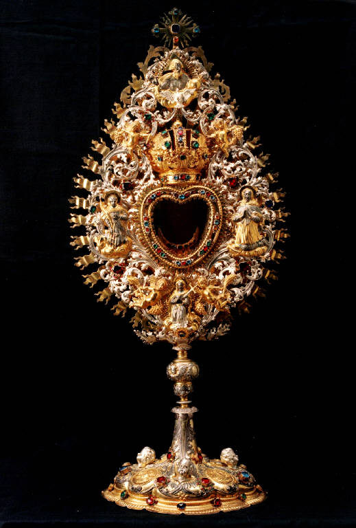Su piede ellittico, dal contorno sagomato, con 4 testine alate alternate ad altrettanti medaglioni con i simboli degli Evangelisti a sbalzo, si innesta un fusto a più riprese che sorregge una ricca raggera a cuore rovesciato. Vi sono applicati a sinistra S. Lorenzo, a destra S. Carlo Borromeo, in alto il busto del Padre Eterno, in basso l'Addolorata. Vi sono dorature e molte pietre rosse, azzurre, verdi.