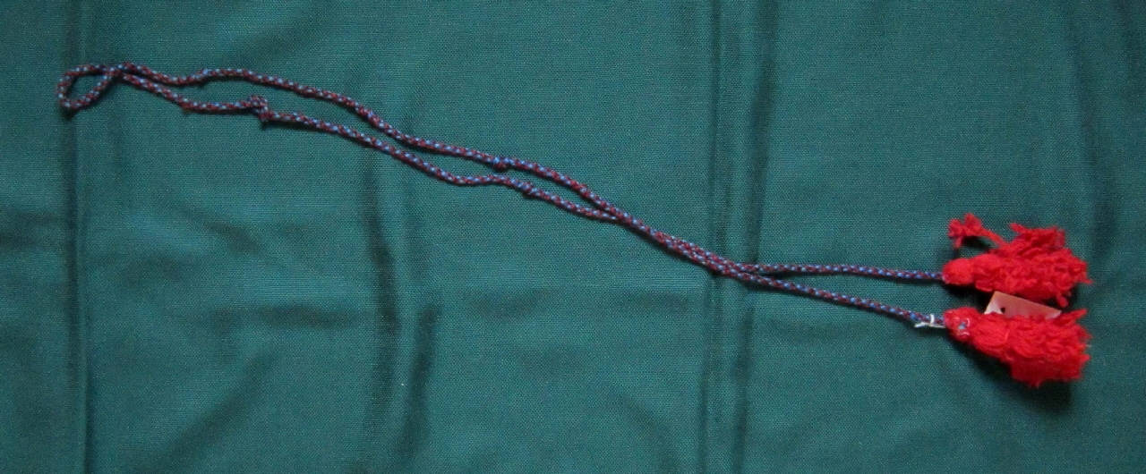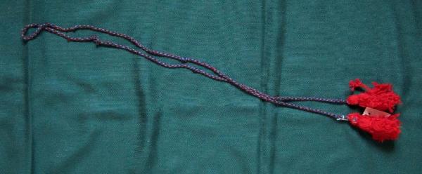 cordone di lana rossa e blu terminante alle estremità con due nappe di lana rossa