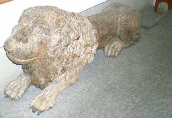 Scultura a tutto tondo eseguita in due pezzi di legno, più la lunga coda. Tracce di coloritura, soprattutto in corrispondenza del muso (occhi) e delle zampe (artigli).
