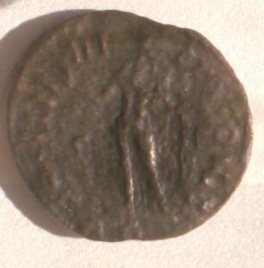Moneta in bronzo di forma non perfettamente circolare. Sukl recto compare una figura antropomorfa non identificata, lungo il bordo corre un'iscrizione. Anche sul verso vi è un'iscrizione.