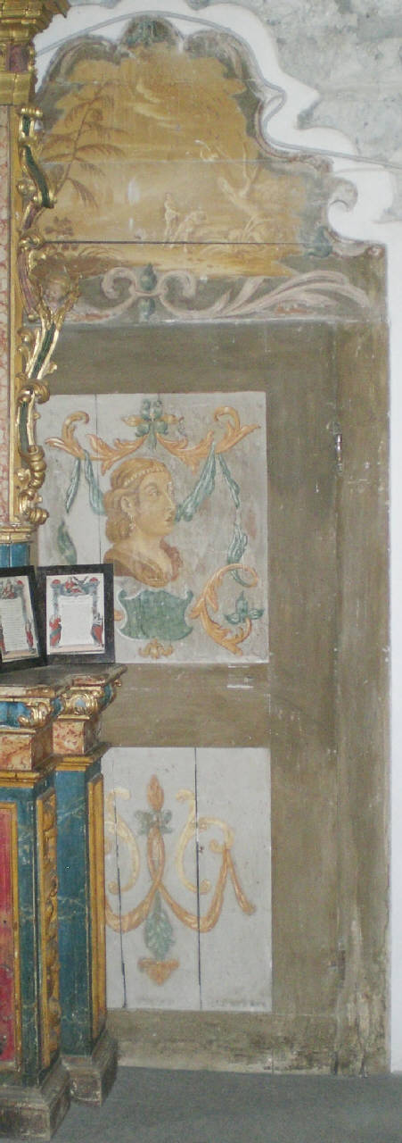 Sovrapporta con perimetro mistilineo simile a cartoccio, impostata su stipite di porta. Coloritura di fondo grigia, elementi decorativi di volute floreali e figurazione centrale in monocromo ocra.