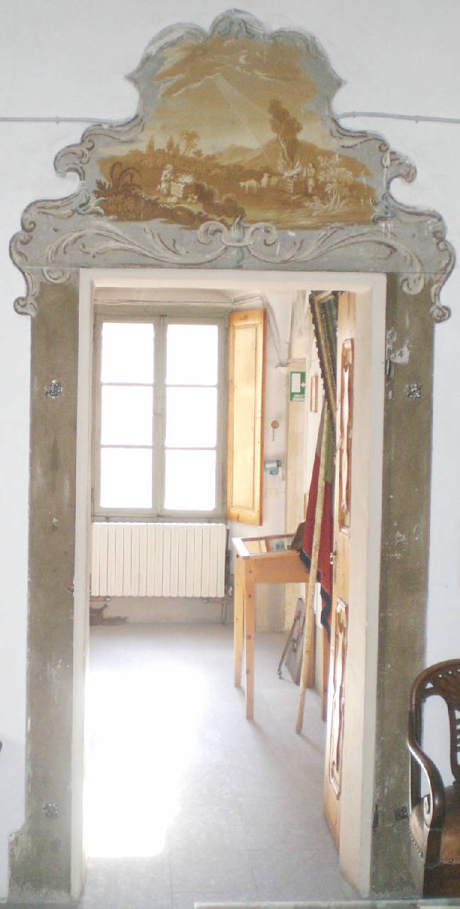 Sovrapporta con perimetro mistilineo simile a cartoccio, impostata su stipite di porta. Coloritura perimetrale grigia, elementi decorativi di volute floreali e figurazione centrale in monocromo ocra. Quattro elementi in ferro a volute infissi negli stipiti. Manca il battente della porta ma restano i due cardini in ferro.