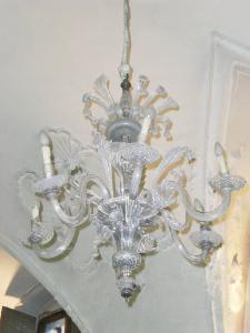 Lampadario in vetro costituito da sei bracci con andamento a esse con piattellini terminali e cilindretti ove sono inserite le finte candele. I bracci sono connessi ad un corpo centrale sagomato, a più nodi, di cui il centrale esagonale, arricchito di fiori, foglie e palmette tutte in vetro. Fogliette allungate spuntano anche dal piattellino centrale posto sopra il fusto, con puntale terminante in metallo, che consente la sospensione del lampadario grazie ad una lunga catena che parte dal soffitto. Attraverso un meccanismo posto al piano superiore, il lampadario può essere calato. Originariamente la fonte luminosa era costituita dalle candele, sostituite in epoca moderna da lampadine elettriche.