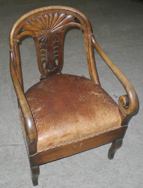 Poltroncina di legno con sedile imbottito ricoperto in cuoio fissato con borchie tonde. Le gambe sono a base quadrangolare, le anteriori con leggerissimo andamento ad esse; lo schienale è intagliato e traforato con elementi fitomorfi stilizzati; i braccioli terminano con un'ampia voluta rivoltata all'ingiù verso l'interno.
