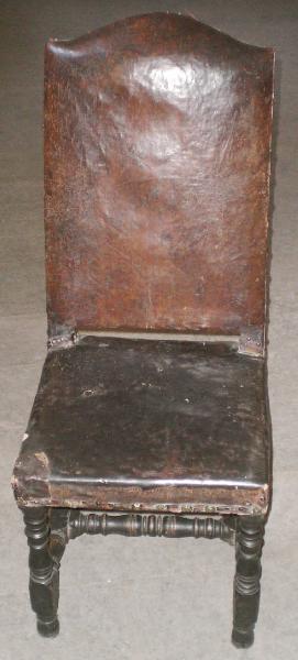 Sedia con sedile quandrato e alto dossale a terminazione curva, in cuoio; gambe e traversa in legno lavorati al tornio. Cuoio fissato allo scheletro in legno con borchie metalliche tonde.