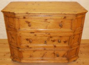 Mobile in legno di cembro poggiante si piedini tondi schiacciati.\nPresenta tre cassetti, sfaccettati nella porzione terminale, divisi in tre specchiature (la centrale più ampia) bordate da cornici modanate. Ogni cassetto dispone di due pomoli per l'apertura, in legno tornito. Il cassetto centrale è munito di chiave per chiusura.