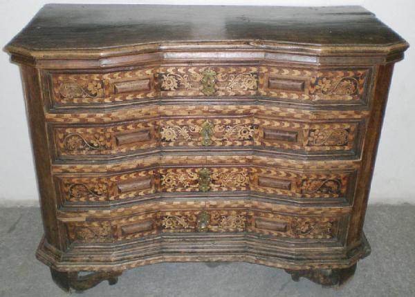 Mobile in legno di cembro poggiante si piedi sagomati con volute appena accennate.\nPresenta quattro cassetti, sfaccettati, decorati ad intarsio con motivi vegetali stilizzati e fasce con tasselli più chiari e più scuri alternati; bordati da cornici modanate. Ogni cassetto dispone di due manici terrangolari per l'apertura, in legno. Vi sono quattro piastrine d'ottone sagomate e decorate che delimitano le toppe per le chiavi, ma solo l'ultimo cassetto e il terzo salendo possono essere chiusi.