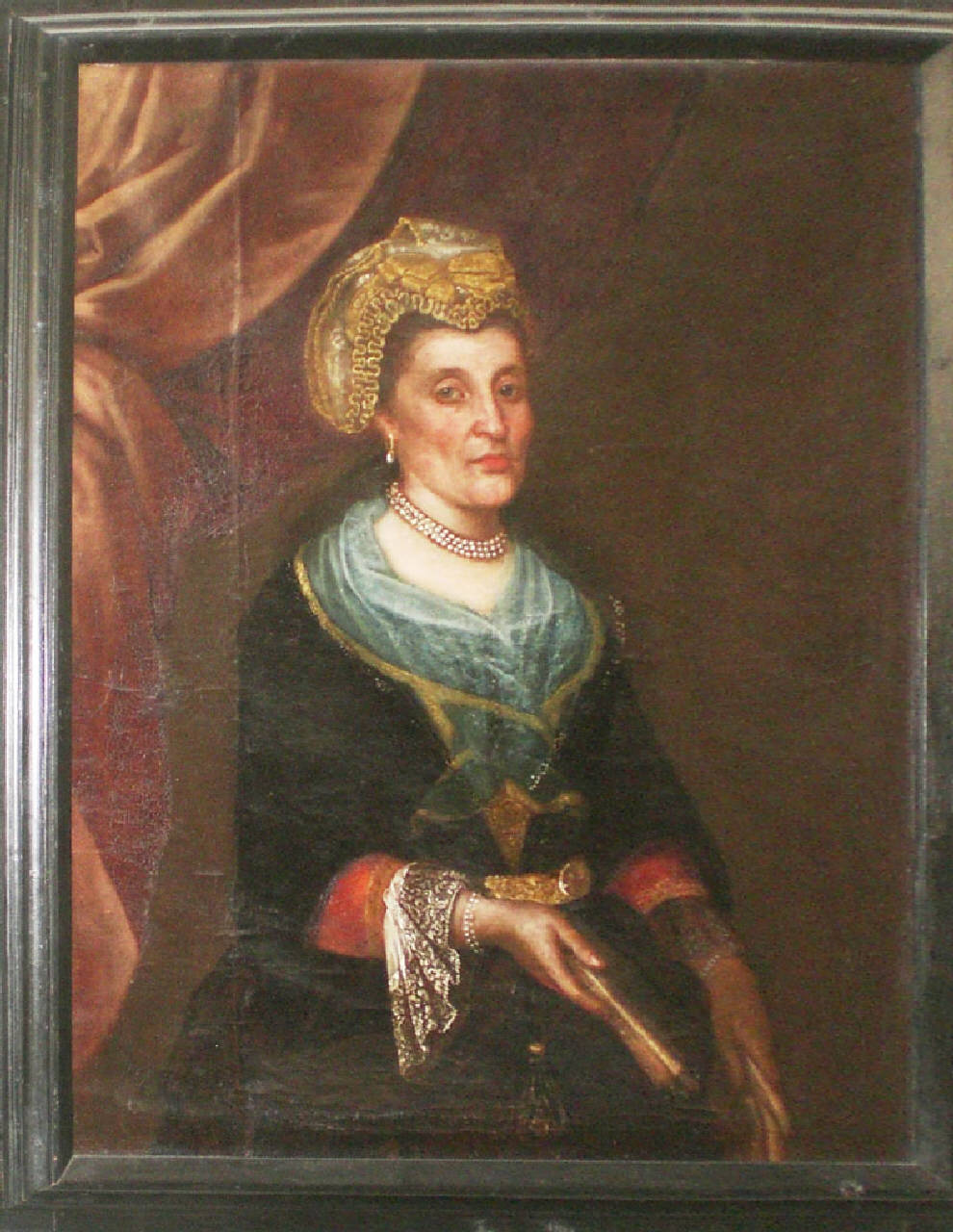 Dipinto a olio su tela, di forma rettangolare, in cornice di legno modanata e dipinta di nero. Vi è dipinta di tre quarti una donna della famiglia De Simoni, con camicetta verde chiara e abito nero bordato da passamaneria dorata. Dalle maniche rosse fuoriescono ricchi pizzi bianchi svolazzanti. Indossa orecchini con perla, al collo una collana con doppio giro di perle, un braccialetto simile alla collana, cintura dorata in vita e sul capo una cuffia arricciata con fiocchi dorati. Nella mano destra tiene un libro, mentre con la sinistra sorregge un risvolto dell'abito. Il viso ha guance incavate. In secondo piano, sulla sinistra, pende un drappo o tenda. Fondo bruno uniforme.