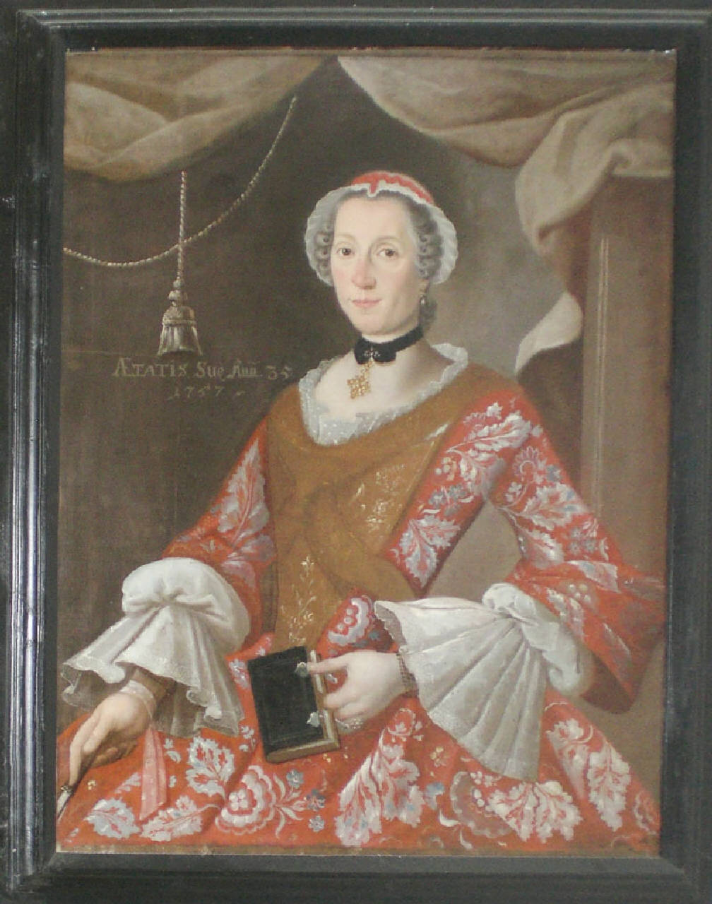 Dipinto a olio su tela, di forma rettangolare, in cornice di legno modanata e dipinta di nero. Vi è ritratta una componente della famiglia De Simoni, vestita di un abito rosso finemente ricamato a fiori azzuri e foglie bianche, con ampio scollo provvisto di pizzi. Completano l'abito ampie maniche con pizzi e una pettorina color ocra ricamata. Al collo porta un nastro di stoffa nera con pendente dorato, mentre sul capo indossa una cuffietta rossa bordata di pizzo bianco. Nella mano sinistra regge un libro, nella destra un ventaglio appena visibile.\nSullo sfondo, un ampio panno drappeggiato, con passmanerie pendenti.\nSulla sinistra, a circa metà del dipinto, la scritta:"AETATIS SUE ANN 35 1757".\nFondo bruno uniforme.