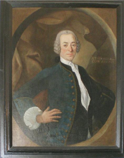 Dipinto a olio su tela, di forma rettangolare, in cornice di legno modanata e dipinta di nero. Entro una finta incorniciatura ovale in prospettiva, vi è ritratto di tre quarti un uomo nobile, probabilmente della famiglia De Simoni. Indossa una marsina verde-blu profilata di marrone, polsini di pizzo bianco, jabot, gilet nero, parrucca grigia. Sullo sfondo si intravede un drappo svolazzante. Sulla destra, all'altezza del viso, vi è la scritta "AETATIS SUE ANN / XLVIII ANN1757".
