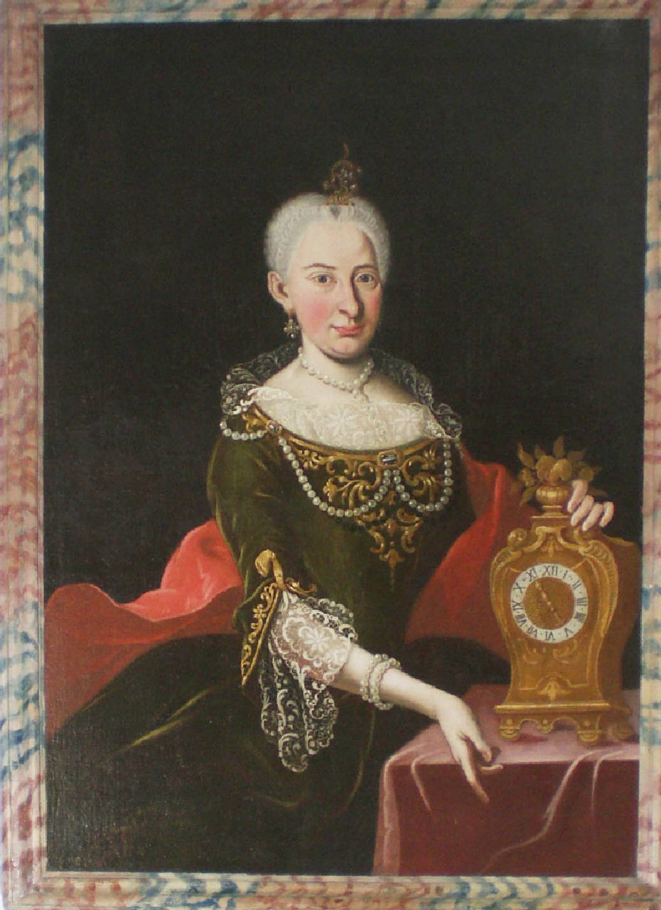Dipinto a olio su tela, di forma rettangolare, in cornice di legno modanata e dipinta, marezzata. Vi è ritratta una componente della famiglia De Simoni, vestita di un abito verde, ricamato d'oro sulle maniche e sul petto, con ampio scollo provvisto di merletti, fili di perle e gemme. Completano l'abito ampie maniche con merletti leggeri. Sul capo indossa un diadema e porta elaborati orecchini di perle, un braccialetto al polso destro. Con la mano sinistra stringe un orologio, a sua volta poggiato su un tavolino in prospettiva; con la destra sembra indicare l'orologio stesso. Fondo scuro uniforme.