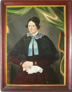 Dipinto a olio su tela, di forma rettangolare, in cornice di legno modanata e dipinta marrone bordata di giallo. Vi è ritratta una componente della famiglia De Simoni, vestita di un abito bordeaux con ampia gonna, uno scialle nero con frange e colletto in merletto bianco, nastro azzurro che cinge il collo, fermato con un gioiello, gioielli fermano anche i polsini. I capelli neri sono raccolti in una elaborata capigliatura con trecce. Le mani sono sovrapposte l'una all'altra e con la destra stringe un fazzoletto bianco. La donna è seduta (si intravede lo schienale della sedia) e poggia il gomitodestro su un piccolo mobile appena visibile sulla sinistra. In secondo piano si nota un tendone verde con passamanerie dorate che pende; fondo grigio.