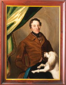 Dipinto a olio su tela, di forma rettangolare, in cornice di legno modanata e dipinta di marrone bordata di giallo. Vi è ritratto di tre quarti un uomo nobile, probabilmente della famiglia De Simoni. Indossa una giacca marrone chiusa da bottoni , gilet a righe, sciarpa nera e pantaloni scuri. Tiene la mano destra in tasca. Un cane bianco poggia le zampe anteriori sulle ginocchia del padrone. In secondo piano, sulla sinistra, pende un drappo verde. Fondo bruno.