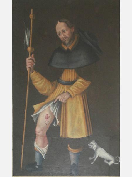 Dipinto a olio su tela, di forma rettangolare. La tela raffigura S.Rocco in atto di mostrare la piaga sulla gamba. Indossa un abito giallo, copleto di mantellina e cappello neri. Si appoggia ad un bastone ed ai piedi ha un cagnolino (raffigurato con sembianze poco comuni).