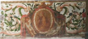 Paliotto d'altare piano, di forma rettangolare. Tela dipinta montata su telaio in legno.\nAl centro un medaglione a monocromo dove compare un santo vescovo in gloria, con le braccia aperte. sopra il medaglione vi è una corona, all'interno della quale spunta una testina. Altri due putti affiancano il medaglione, quello di sinistra di spalle, nell'atto di scostare un drappo e dare visibilità al medaglione stesso. Il drappo costituisce la restante superficie del paliotto, decorato con volute vegetali verdi e rosa, e grandi fiori rosa e azzuri.