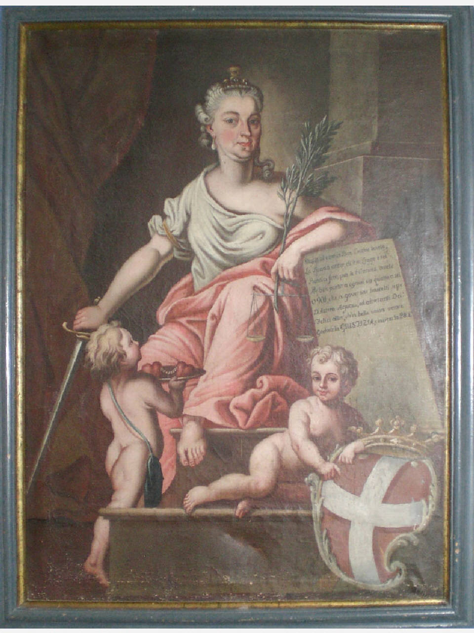 Dipinto a olio su tela, di forma rettangolare, in cornice di legno nera, modanata e in parte dorata. Vi è raffigurata la personificazione della Giustizia, seduta in trono, con spalle scoperte, indossa un abito verde chiaro e un mantello rosso. Tiene nella mano destra una spada, nella sinistra una bilancia ed un ramo di ulivo. La figura regge con il gomito sinistro una lapide dove compare una lunga iscrizione. Sui gradini del trono due putti nudi: uno a destra, in piedi, nell' atto di offrire su un piatto due cuoricini legati tra loro con una catenella d' oro; l' altro, quasi sdraiato su un gradino, a sinistra, appoggiato allo stemma del Contado di Bormio (croce bianca su campo rosso).