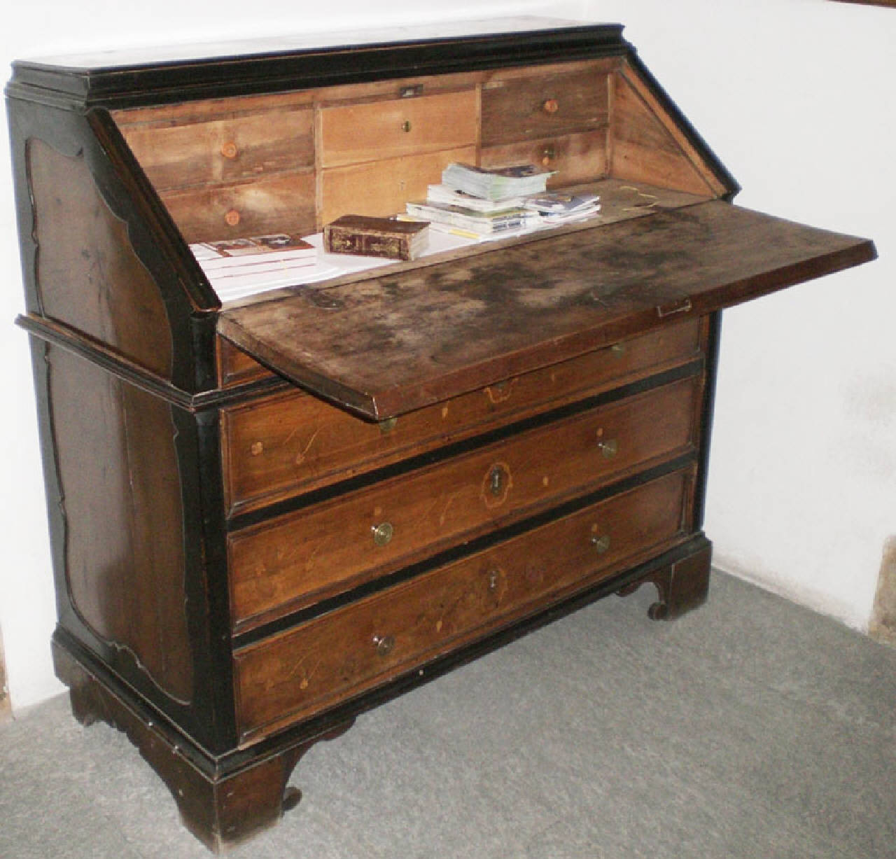 Cassettone in legno, a ribalta con quattro cassetti: il primo cassetto partendo dall'alto è più basso rispetto agli altri tre. Sopra i cassetti è posta un'antina che ribaltandosi crea un piano che funge da scrivania. \nLa facciata dei cassetti e l'antina sono decorati con rami e fiorellini intarsiati. Al centro dell'antina ribaltabile vi è un intarsio in legno che raffigura un vaso, dal quale fuoriescono rami e foglie. Entro la ribaltina vi sono sei cassettini. I quattro cassetti, con serratura, si aprono grazie a dei pomoli d'ottone. Le fiancate del mobile sono decorate con cornice mistilinea.