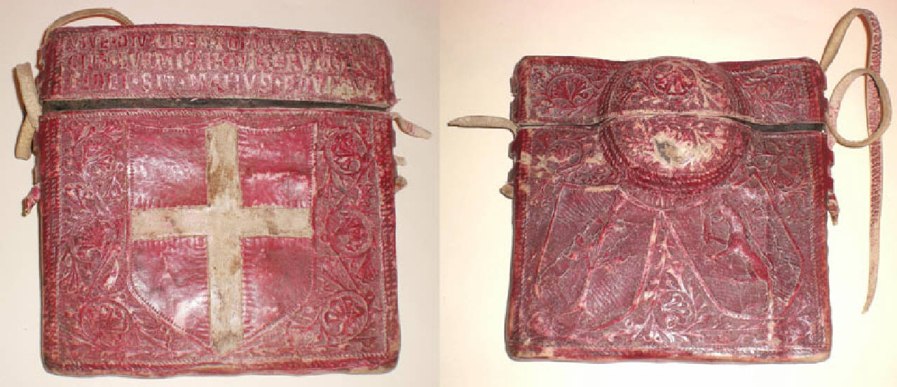 Astuccio in cuoio bulinato , atto a contenere le credenziali ed i pubblici sigilli del Contado di Bormio e affidato agli ambasciatori .\nDi forma quasi quadrata, con rigonfiamento circolare sul verso. Porta sul recto lo stemma del Contado (croce bianca in campo rosso ) con la scritta: " VIVE . DIV. LIBER. POPULUS. SUB. PRINCIPE . BURMI. ANGVIGERVUM. ET .FIDEI . SIT. MANVUS. EQUA. TVE. "\nSu verso sono raffigurati, su due scudi, un leone rampante con spada tra le zampe ed un albero germogliante. E' in cuoio rosso