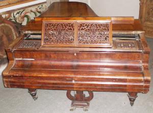 Pianoforte a coda, in legno, con piano rialzabile, leggio lavorato a traforo decorato con racemi e arpe. Io strumento poggia su tre gambe con sezione esagonale provviste di rotelline; supporto per i pedali a forma di lira. La sopratastiera presenta la scritta JAKOB CZAPKA IN WIEN. Lo sgabellino, in legno, ha tre gambe lavorate ed il sedile in pelle, imbottito.