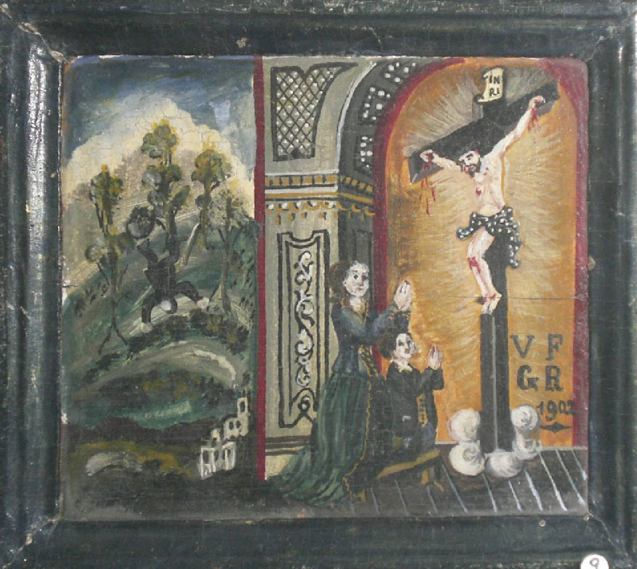 Tavoletta rettangolare di legno dipinta; cornice nera in legno modanata.\nEx voto raffigurante a destra, in una nicchia illuminata da luce giallastra, il Crocefisso con alcune nuvolette bianche ai piedi della Croce; al centro, davanti all'esterno della nicchia riccamente decorata, una donna con vestito verde e giacca nera orlati di ricami gialli, ed un bambino vestito di nero con fazzoletto bianco al collo, inginocchiati in preghiera. A destra un paesaggio con case, piante e montagne. Tra le piante si intravede una persona vestita di nero mentre sta cadendo, a capo all'ingiù, da un albero. Ai piedi della Croce, le lettre in nero: V.F.G.R. e la data: 1902