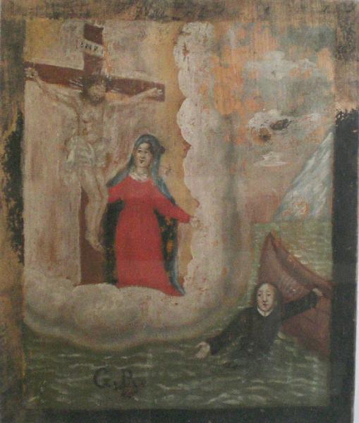 Tavoletta rettangolare di legno dipinta; finta cornice nera dipinta.\nEx voto raffigurante un sacerdote che affiora, a mezzo busto, dalle acque, mentre con la mano sinistra si aggrappa ad una imbarcazione; in alto a sinistra, il Crocefisso con a lato la Vergine, entrambi tra nuvole bianche. In basso, quasi al centro, due lettere in nero: G.R.