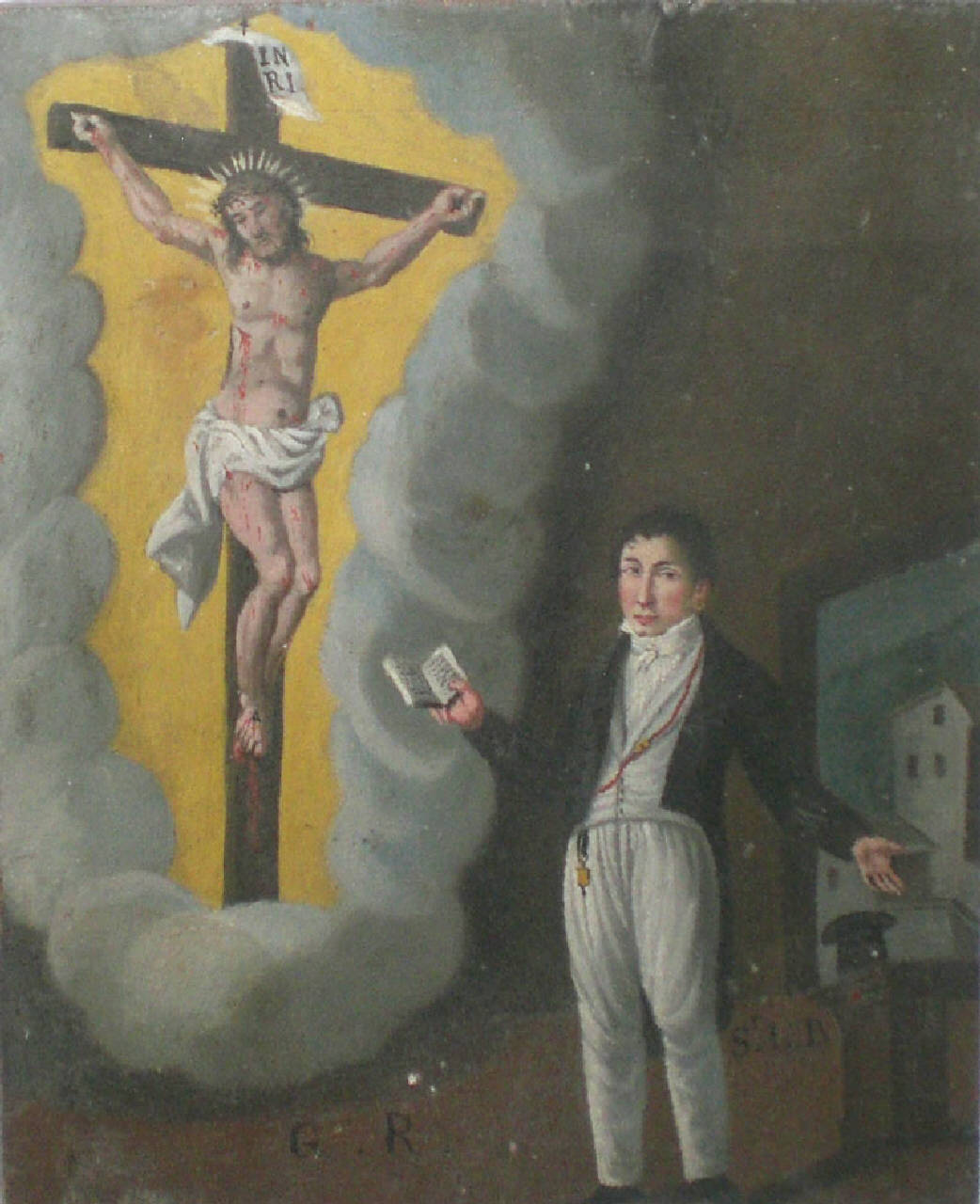 Tavoletta rettangolare di legno dipinta.\nEx voto che raffigura a sinistra: il Crocefisso tra nuvole biancastre e luce gialla; a destra: in basso, un uomo in piedi, con pantaloni e camicia bianca, giacca nera, con un libro aperto nella mano destra e con orecchino nell'orecchio sinistro. Sempre a destra, in basso, un'apertura da cui si intravedono delle case; al centro, all'altezza delle ginocchia dell'uomo, le lettere G R a sinistra, Sr L.B. a destra.