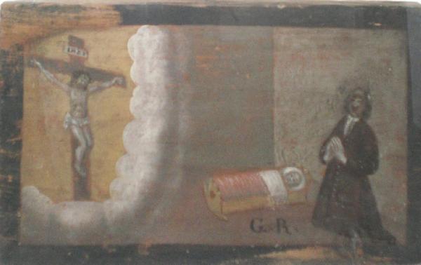 Tavoletta rettangolare di legno dipinta; finta cornice nera dipinta.\nEx voto raffigurante a destra in basso, un uomo inginocchiato in preghiera, vestito di nero con fazzoletto bianco al collo; a sinistra, il Crocifisso tra nuvole bianche; al centro, una culla con un bambino e sotto le lettere: G.R.