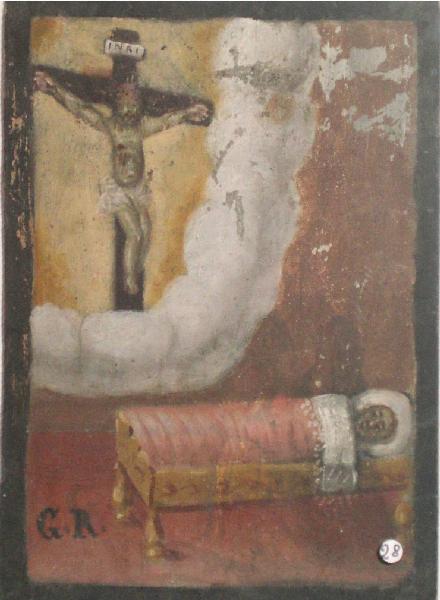 Tavoletta rettangolare di legno dipinta; finta cornice nera dipinta.\nEx voto raffigurante a destra in basso, una persona distesa su un lettino con coperta rossa; in alto a sinistra tra nuvole bianche, il Crocefisso. In basso a sinistra, due lettere in nero: G.R