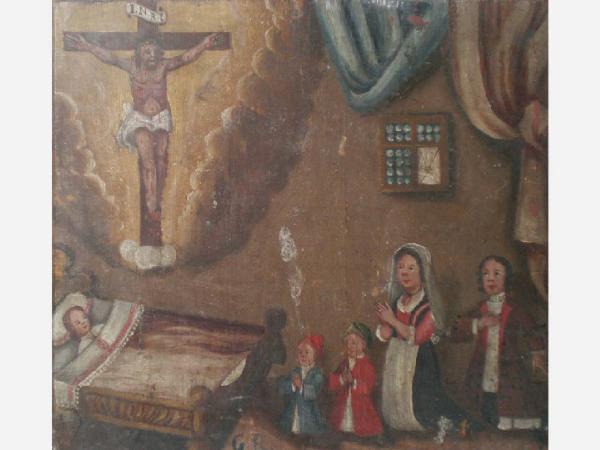 Tavoletta rettangolare di legno dipinta.\nEx voto che raffigura a sinstra, in basso, un letto nel quale è posto un bambino tra lenzuola bianche ed orlate di pizzo; a destra, in basso, una famiglia composta da padre, madre e due bambini, tutti inginocchiati; a sinistra, in lato, il Crocefisso tra nuvole bianche e nere e luce gialla. A destra, in alto, drappi azzurri e biancastri e sotto una specie di finestra. Ai piedi del letto, le lettere: G.R. \nSul retro si legge: "Silvestro Imeldi di Sondalo VFGR 1752".