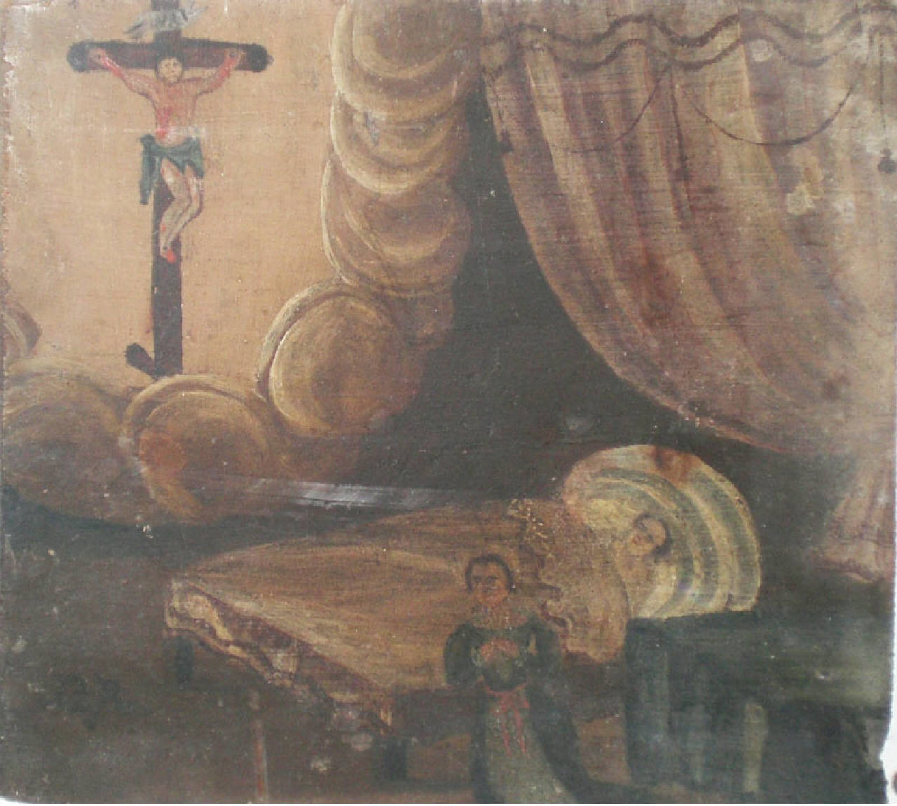 Tavoletta rettangolare di legno dipinta.\nEx voto che raffigura in basso, al centro, in un letto con testiera semicircolare, un infermo tra coperta biancastra e lenzuolo con pizzo bianco; accanto ad esso, una donna inginocchiata con le mani congiunte, con vestito scuro e grembiale chiaro; a sinistra, in alto, il Crocefisso tra nuvole biancastre; \na destra, un drappo chiaro; in basso, a sinistra, le lettere in nero, G.R.