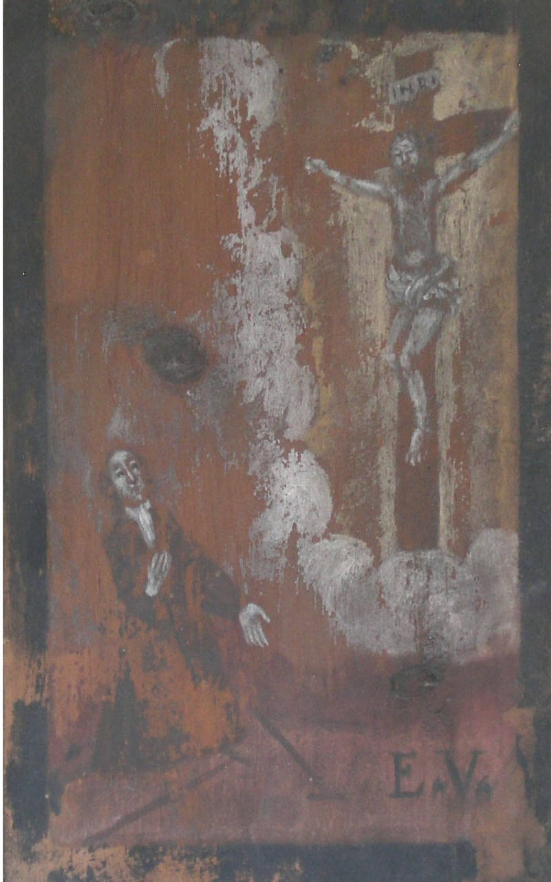 Tavoletta rettangolare di legno dipinta; finta cornice nera dipinta.\nEx voto raffigurante a sinistra in basso, un uomo inginocchiato, vestito di nero con fazzoletto bianco al collo, che getta due stampelle di legno; in alto, a destra, il Crocefisso tra nuvole bianche. In basso a destra, in nero, le lettere: E.V.