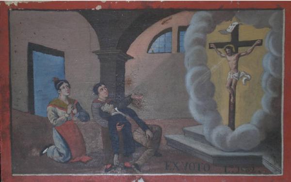 Tavoletta rettangolare di legno dipinta; finta cornice rossa dipinta.\nEx voto raffigurante al centro, una donna mentre sorregge un uomo svenuto vestito con pantaloni chiari e giacca nera, ed un'altra donna inginocchiata con le mani giunte, vestito azzurro chiaro, grembiule rossiccio, scialle giallastro ad orlo rosso; a destra, il Crocefisso tra nuvole bianche e luce gialla, posto su due gradini. \nSullo sfondo, una colonna sostenente archi a tutto sesto, una pota ed una finestra semicircolare. \nIn basso a destra, una scritta: EX VOTO e la data L°1832\nSul retro, in corsivo, è scritto: \n"UN VUOTO DA FARSI PER ANTONIO TENCI"