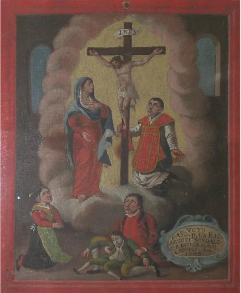 Tavoletta rettangolare di legno dipinta; finta cornice rossa dipinta.\nL'ex voto raffigura: in basso, al centro, un uomo a terra che sorregge un bambino; a sinistra, una donna inginocchiata con le mani giunte, con vestito nero, grembiule chiaro a puntini azzurri, camicia rossa, fazzoletto marrone chiaro con orlo azzurro ricamato; al centro in alto, il Crocefisso affiancato a sinistra, dalla Vergine vestita di rosso con manto azzurro, e da una figura di sacerdote, inginocchiata, con pianeta rossa, circondati da nuvole rosse. \nIn basso a destra, in una cornoce barocca e dipinta di azzurro, una scritta: "VOTO FATO p UN RAGAZZO DI SONDALO CHE PATISCE IL MAL CADUCCO. Anno 1829".\nSul retro, in corsivo, si legge: "per Antonio Lengazzi di Sondalo dacordo un bavarese".