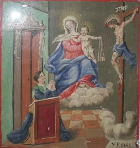 Tavoletta rettangolare di legno dipinta; finta cornice rossa dipinta.\nEx voto raffigurante in basso, a sinistra, su un inginocchiatoio rosso, una donna con le mani giunte, vestita di azzurro e con un fazzoletto al collo verde chiaro; al centro posta su nuvole bianche, la Vergine del Carmine vestita di rosso con manto azzurro e velo bianco che sorregge il Bambino, ignudo e con lo scapolare nella mano destra. \nA destra il Crocefisso ai piedi del quale stanno delle nuvolette bianche. Sul pavimento, a mattonelle bianche e giallastre, a destra, la data : V.F. 1868. Come sfondo, siulla sinistra, una porta. Sul retro, in corsivo, : Pedrini Antonio 1868 Bormio.