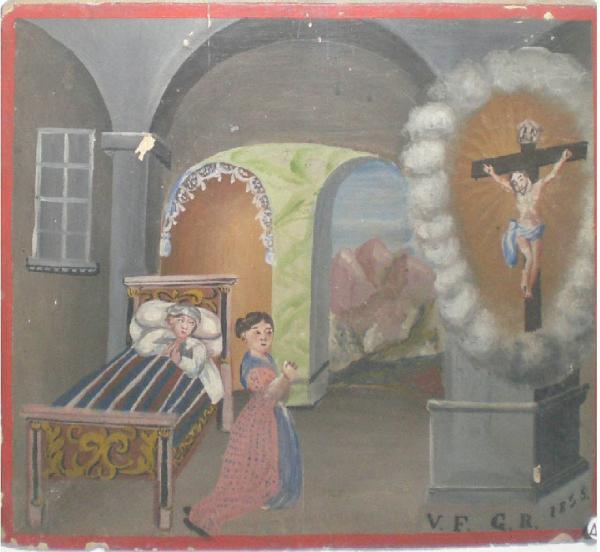 Tavoletta rettangolare di legno dipinta; finta cornice rossa dipinta.\nL'ex voto raffigura: sulla sinsitra, in un letto con testiera e pediera a disegni gialli colonnine nere con capitelli giallastri, un infermo con le mani giunte, camicia bianca e panno bianco sulla fronte, e coperto da un drappo a strisce marroni, blu e bianche. Accanto al letto, sulla destra, una donna inginocchiata, con vestito rosa a puntini azzurri, grembiale e scialle azzurri. A destra, circondato da nuvole bianche e raggi di luce, il Crocefisso. \nSullo sfondo, tra arcate, si vedono delle montagne. \nA sinistra, in alto, una finestra. A destra, in basso, le lettere in nero VFGR e la data : 1855.