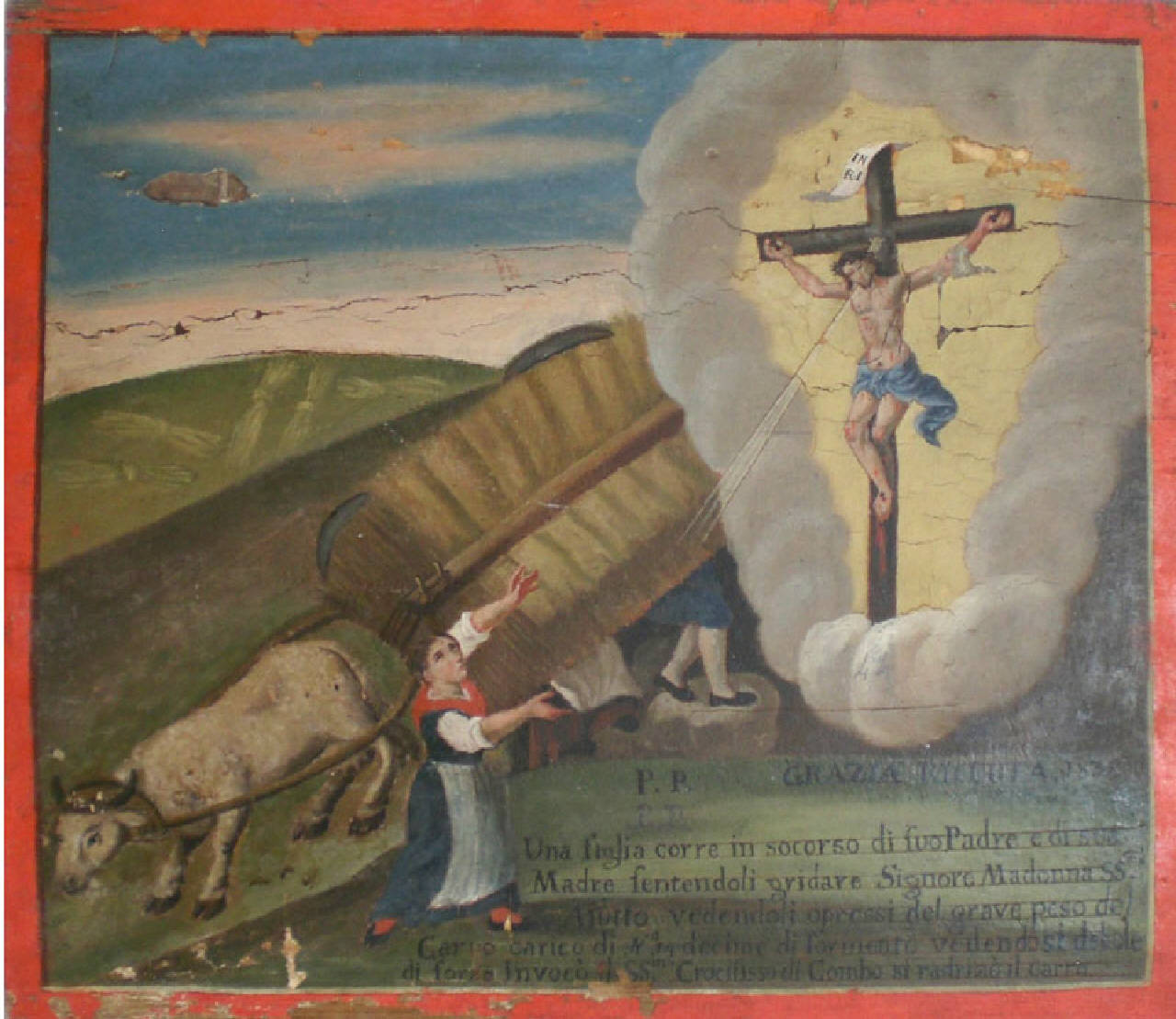 Tavoletta rettangolare di legno dipinta; finta cornice rossa dipinta.\nL'ex voto raffigura: sulla destra, entro nubi, si vede il Crocefisso. Da questo partono dei raggi che vanno a raggiungere un carro rovesciato, tirato da un bue bianco, che schiaccia due persone. A lato del carro si trova una ragazza con le braccia rivolte verso l'alto, implorante aiuto al Crocefisso per i genitori. Compare la scritta: "PP Grazia ricevuta 1832. Una figlia corre in soccorso di fuo padre e di sua madre fentendoli gridare Signore Madonna Santissima aiuto. Vedendoli oppressi dal grave peso del carro carico di n. 14 decime di formento, vedendosi debole di forze invocò il SSmo Crocefisso di Combo si raddrizzò il carro".