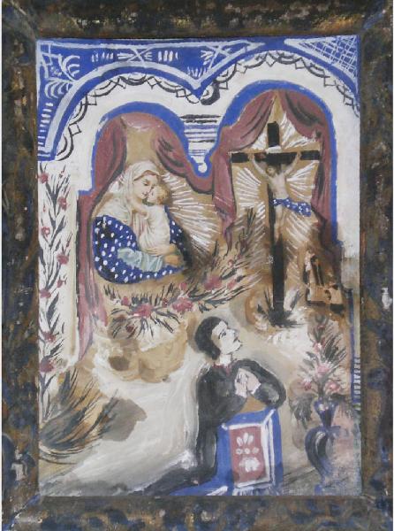Quadretto di cartoncino dipinto, con conicetta nera. L'immagine della Madonna è ritagliata e incollata (collage).\nEx voto che rappresenta sulla destra, sotto arcata, il Crocefisso. Ai piedi di questo vi sono un sacerdote ed un chierico inginocchiato Sotto l'arcata di sinistra è raffigurato un quadro della Madonna con il Bambino (questa immagine con quella del Crocefisso e dei chierici, è incollata da immagine presa da stampa, ritagliata ed applicata). In primo piano c'è un uomo in abito nero, inginocchiato su inginocchiatoio con parte anteriore decorata a fiori. Accanto a lui c'è un vaso con dei fiori.
